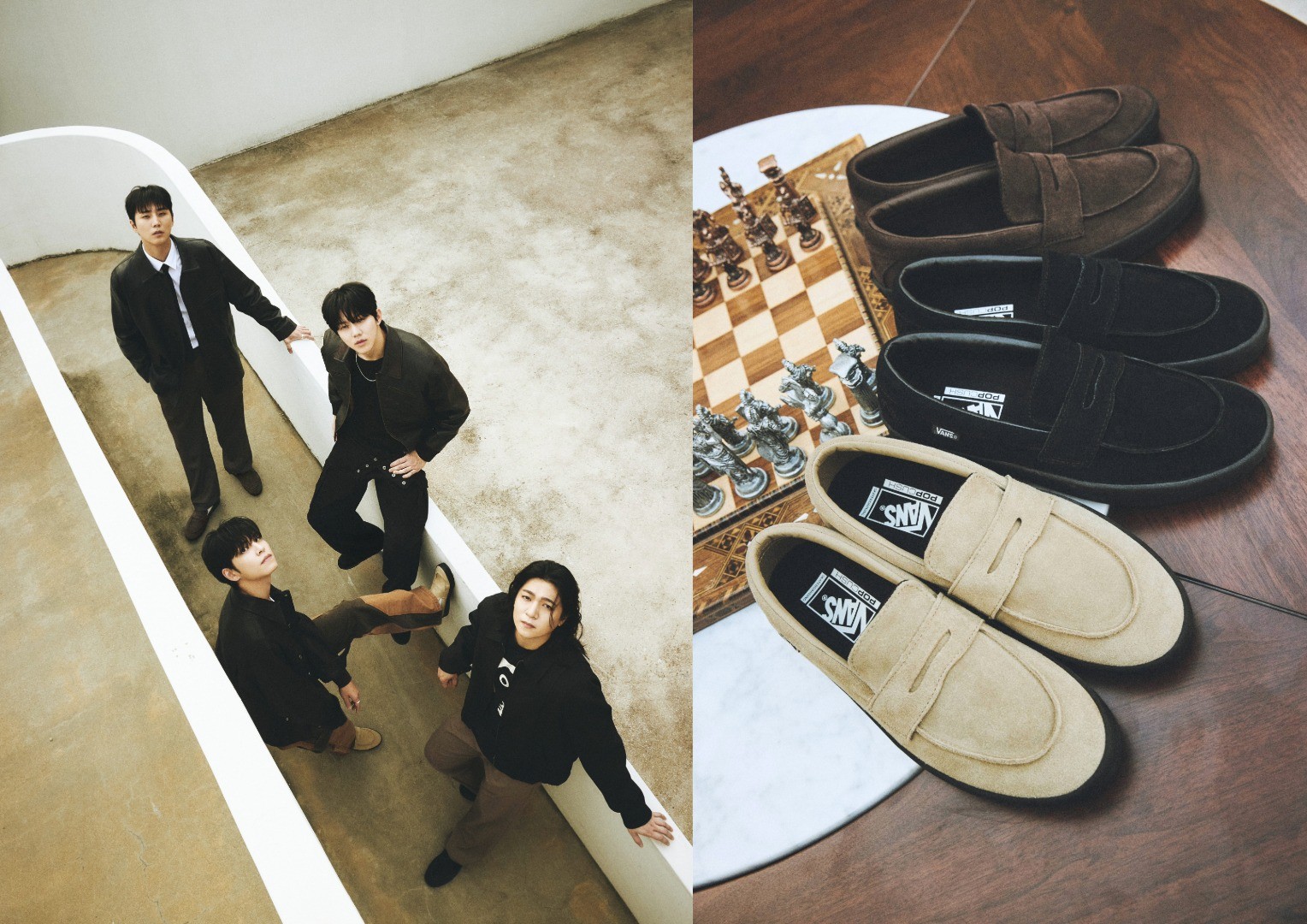 공개된 화보 속 네 멤버는 25FW 컬렉션의 핵심 실루엣을 선보인다. 1977년 스타일 #36(Style #36)이라는 이름으로 처음 등장하여 현재까지 반스의 아이코닉한 실루엣으로 사랑받는 올드스쿨, 스케이트 구조의 로퍼로 높은 내구성을 자랑하는